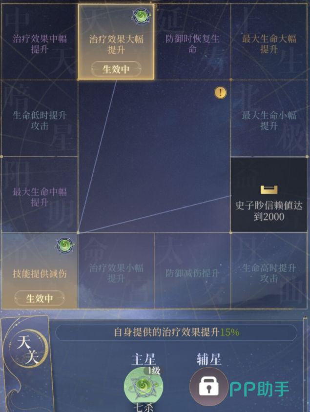 孙尚香:首选天府+左辅,次选七杀+火星,最次选廉贞/太阴+天巫/八座,替补太阳+巨门。孙尚香低星血量过低时主星考虑太阳+巨门,辅星火星+八座,有助于持续输出。