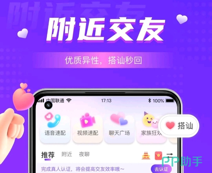 帮助用户朋友快速脱单的交友app。同城约会功能不仅可以让你与心仪的人互相赠送小礼物,还可向周围的亲朋好友秀恩爱;视频认证帮你避免“照骗”,助你找到心目中的帅哥美女;欢乐交友自带各种有趣的题型,助你避免尬聊;视频速配让你们的聊天更加充满趣味。