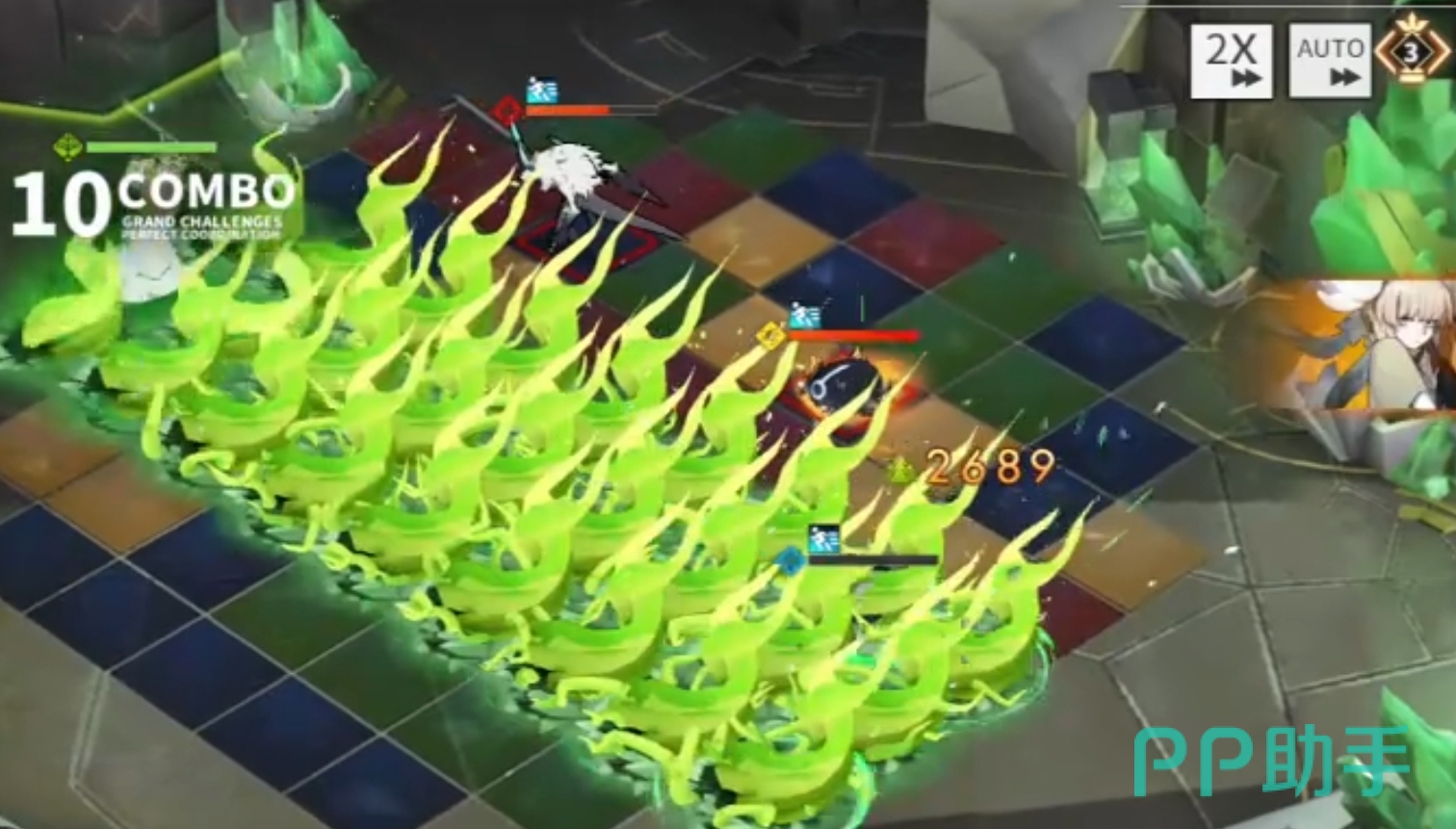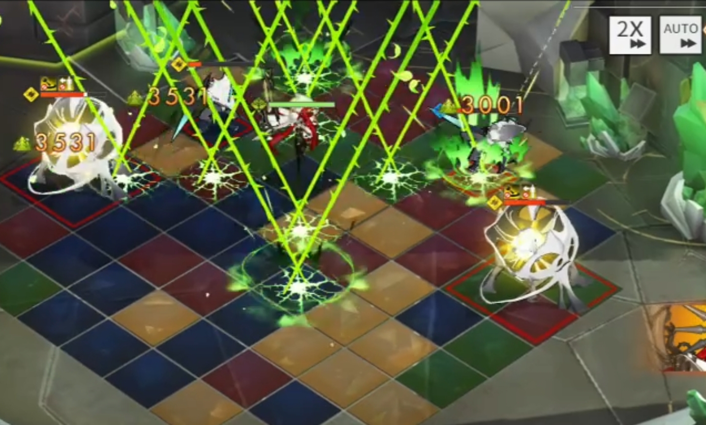 连锁技“影棘”,四倍:对周身2圈的3个敌人造成攻击力165%的伤害;八倍:对周身圈的3个敌人造成攻击力170%的伤害;十二倍:对周身3圈的4个敌人造成攻击力180%的伤害。最多可对4个敌方单位造成伤害,在面对多个小怪会有不错的表现。