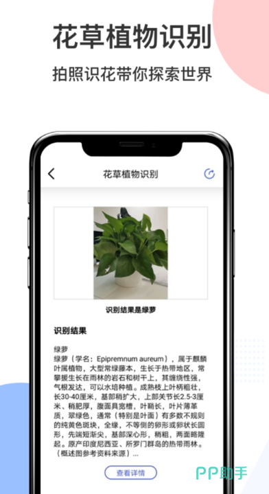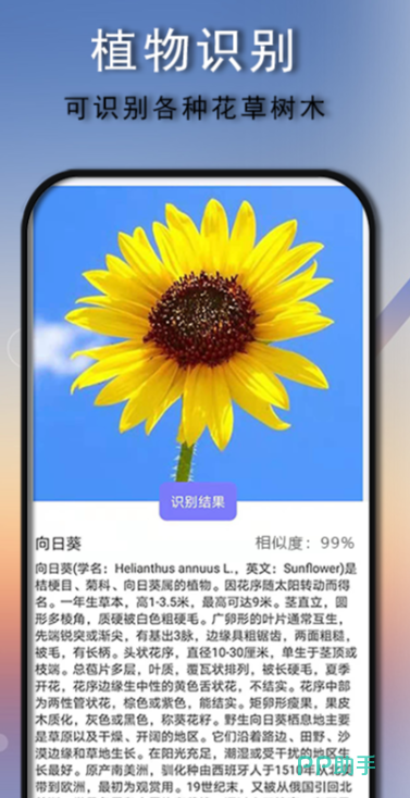 植物识别app可以进行智能拍照识图,不认识的花鸟鱼虫可以点击图片或者照相来查询,此款软件的识别准确率较高,识别出来的结果可以进行丰富百科解读,几乎涵盖了身边所有物体,识别类别多样化,随时随地的想扫及扫。