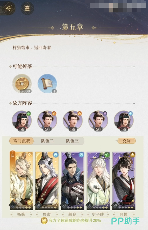 反正不管怎么样,杨修肯定得顺利放出大,能多放几次更好,因为运气好的话随机到一个比较高的伤害倍率,他是可以直接单秒一人的。然后水系山贼可以交给阿蝉处理,剩下的几个则可以在清除掉阴系和水系之后分别再处理,这关的敌人没有很肉的,所以对鲁肃的劝退也没有很高要求。