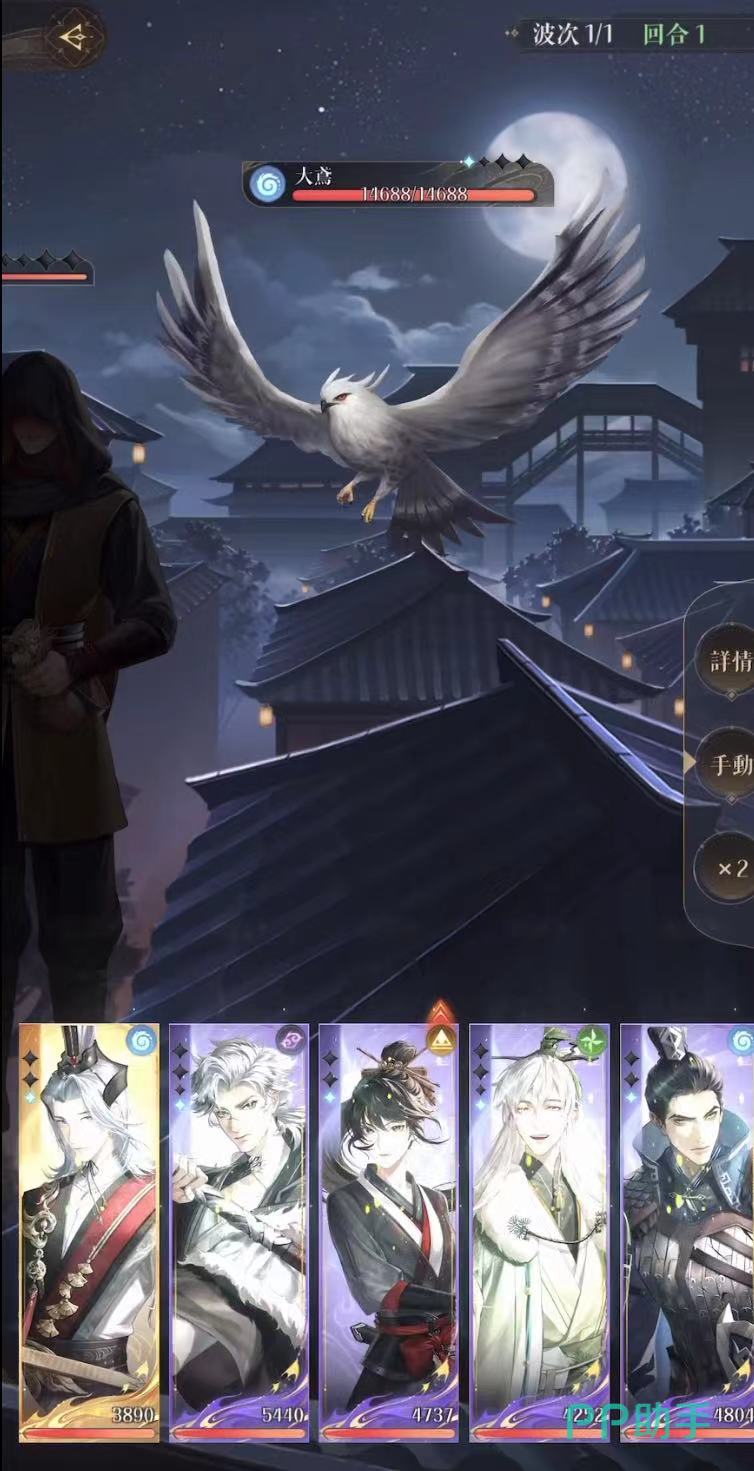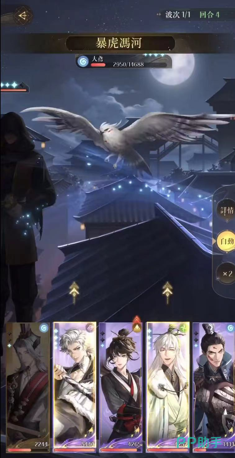 打法流程:第一与第二回合全员集中攻击大鸢,尽可能磨低血量。大鸢血量是14,688,阿蝉对它有伤害增益加成。第3回合鲁肃阿蝉大招好了就放,鲁肃劝退不成功比较好,如果劝退掉这只大鸢,情报贩子下一回合就会召唤一只满血的。