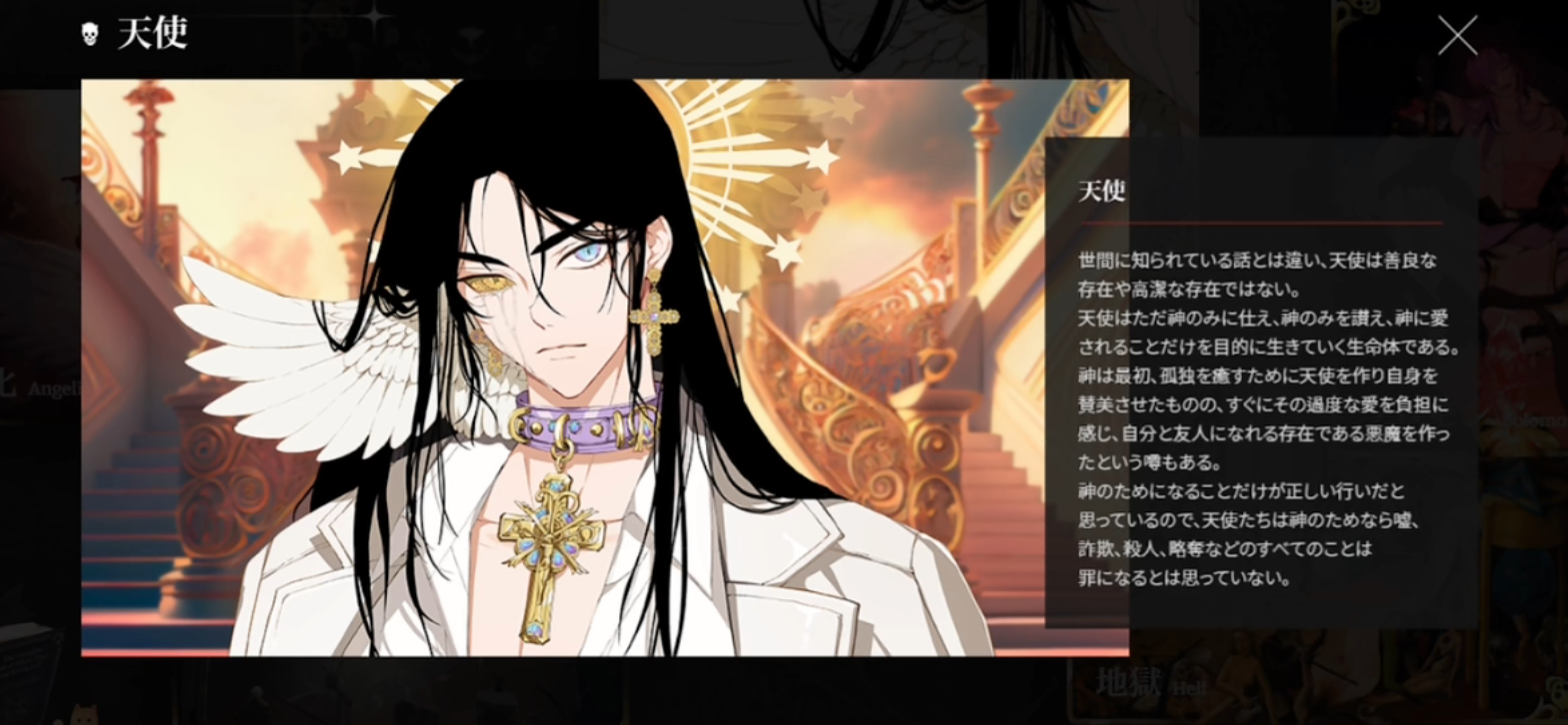 就在他展开六翼,挥舞镰刀杀死我们之际,另一个陌生男人救了我们。他告诉我们,他是恶魔,我们则是所罗门的后代,要带我们去往地狱。