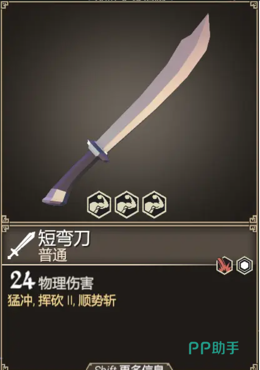 短弯刀,不错的白色单手剑武器,24点的伤害并带有猛冲和挥砍效果,其总量伤害不逊色于一些蓝装,紫装等。如果玩家们前期搞得到的话,是一款非常不错的武器。