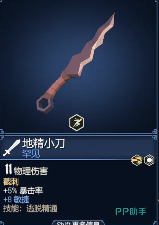地精小刀,蓝色装备的单手武器,基础伤害不高,只有11点。但是技能逃脱精通非常有用,能在遇到危险的时候保自己一命。相比而言,他自身附带的那些暴击率就类似于赠品了。