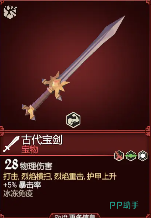 古代宝剑,游戏中最好用的宝剑武器之一,28点的基础物理伤害,并附带有打击,烈焰横扫,烈焰重击,护甲上升等一系列效果,并且作为火焰武器的它还额外增加了5%的暴击率以及非常重要的冰冻免疫效果,在对付冰属性敌人时非常有用,简直就是神器。