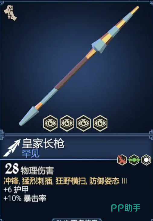 皇家长枪,游戏中在所有长矛武器中基础伤害排得上队的武器之一。有着极为罕见的28点的物理伤害加成,并且本身带四个效果,其中防御姿态有三级,并加了六点护甲和10%的暴击率,最好用的蓝色武器之一。