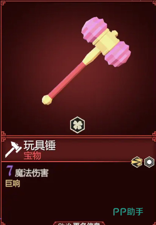 玩具锤,在红色武器中也是奇葩的一个。其基础只有七点的魔法伤害,甚至不如一把白装的小刀。且带有巨响效果,是一个具有特殊用途的武器。
