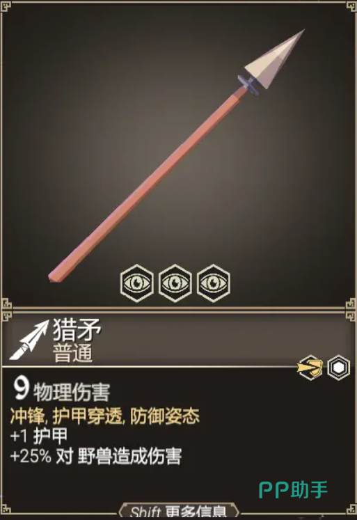 长矛武器方面,非常推荐各位玩家们选用猎矛作为开始的初始武器。尽管基础伤害方面较低,但是额外拥有着护甲穿透冲锋和防御姿态的效果,并且护甲加一,对野外野兽造成额外25%的伤害。