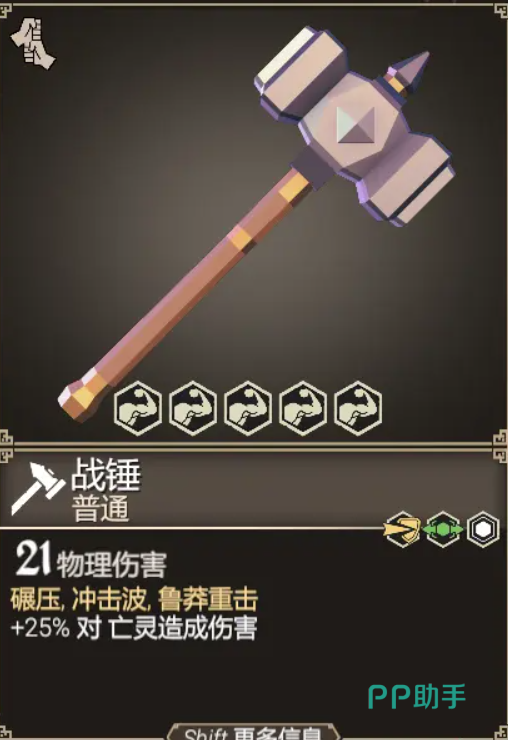 战锤,双手锤21点的物理伤害,并带有碾压和冲击波效果。且附带25%的对亡灵伤害提升,在打骷髅怪的时候非常的有用,一锤子下去能死一片骷髅。