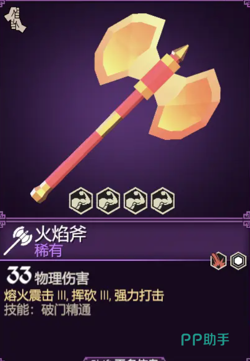 火焰斧,游戏中最好的斧头之一。在某些情况下,比红斧头还要有用。33点物理伤害并带上了三级的熔岩震击和三级的挥砍,并且还自带技能破门精通,要伤害有伤害,要功能有功能,特别好用。