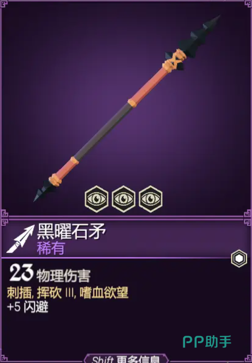黑曜石矛,游戏中长矛武器当中最好用的武器。23的物理攻击力,并且额外加五点闪避效果,挥砍等级还有三,在对局作战环境下非常好用。