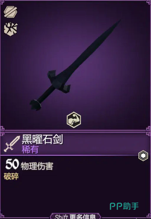 黑曜石剑,游戏中基础物理伤害最高的一批武器。其基础的物理伤害加成总共有50点,这种伤害加成远比某一些红装要高的多。且还带来一个破碎属性,非常厉害的一把武器。唯一的缺点可能就是技能少了点,不过伤害够高,一力破十会也不是不行。
