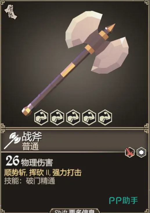 战斧,这把武器是所有白装斧头武器当中最好用的了。26点的物理伤害,并带两级挥砍以及技能破门精通,在清理障碍以及伤害能力方面都有自己的用处。