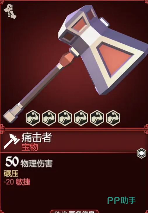 痛击者双手重锤,顾名思义是游戏中力量属性最高的重锤武器。有着游戏中顶级的50点伤害加成,且附带一个碾压效果。不过也因此,虽然伤害很高,但是会对力量要求苛刻,减少了20点的玩家敏捷,不常用。