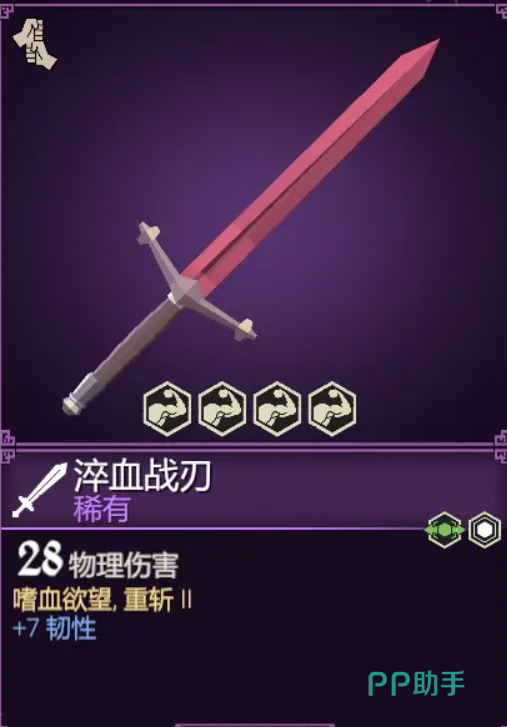 淬血战刃,少有的带有嗜血欲望的武器,并带两级的重斩,在对敌过程中还是很有用的。此外,基础还加七点的韧性,一定程度上增加了战斗的容错率。