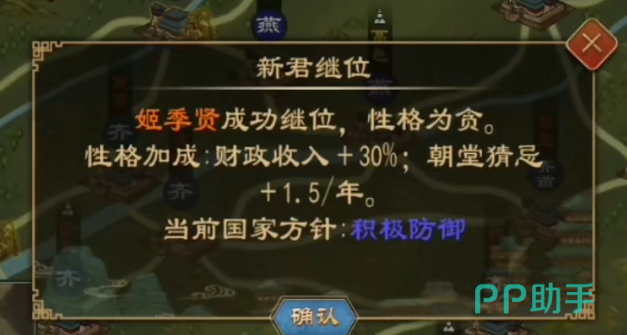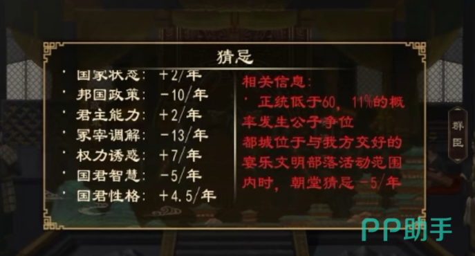 负面性格的贪、疑等都会让周围的国家对你产生猜疑,并且大臣们也会日渐对你不信任,这就是负面的性格带来的毁灭性灾难,所以在初期选人的时候就要注意性格的选择了。