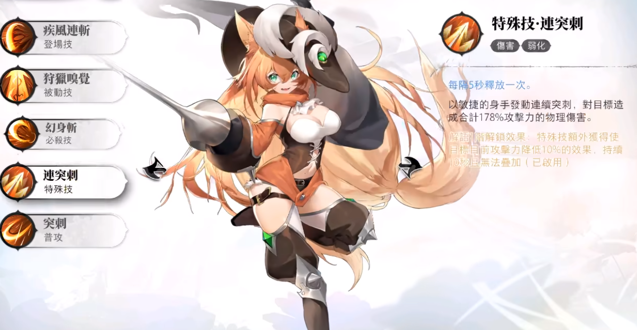 特殊技能:每5秒释放一次,以敏捷的身手发动连续突出,对目标造成合计178%攻击力的物理伤害。