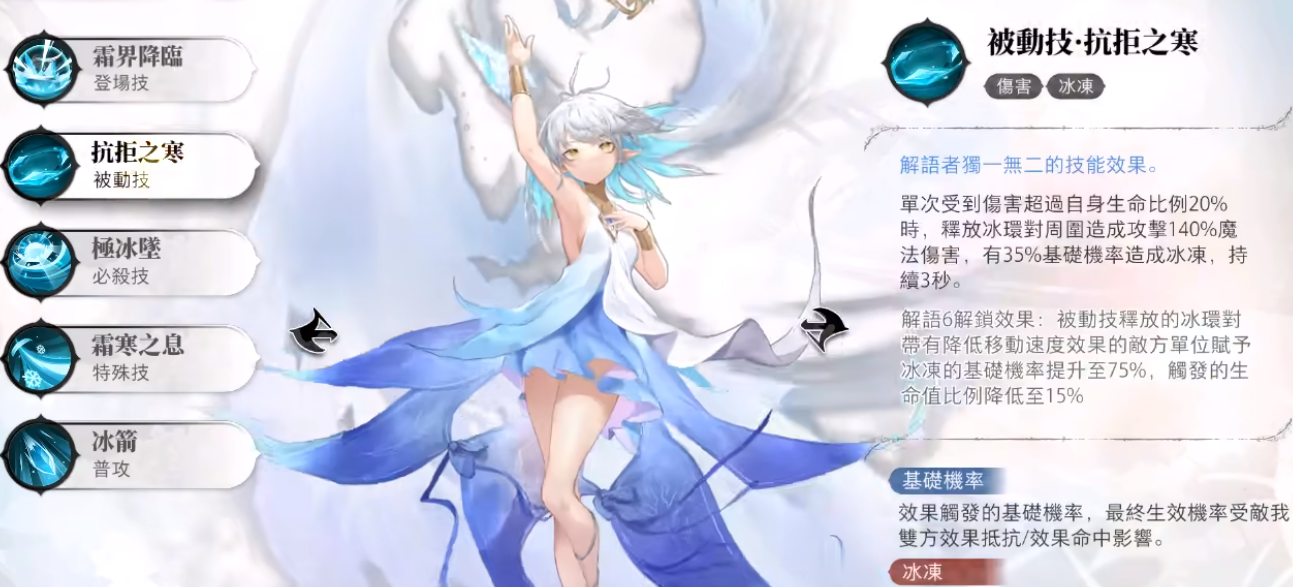 被动技能:单次受到伤害超过自身生命值比例20%时,释放冰环对周围造成140%攻击力的魔法伤害,有35%的概率造成冰冻。