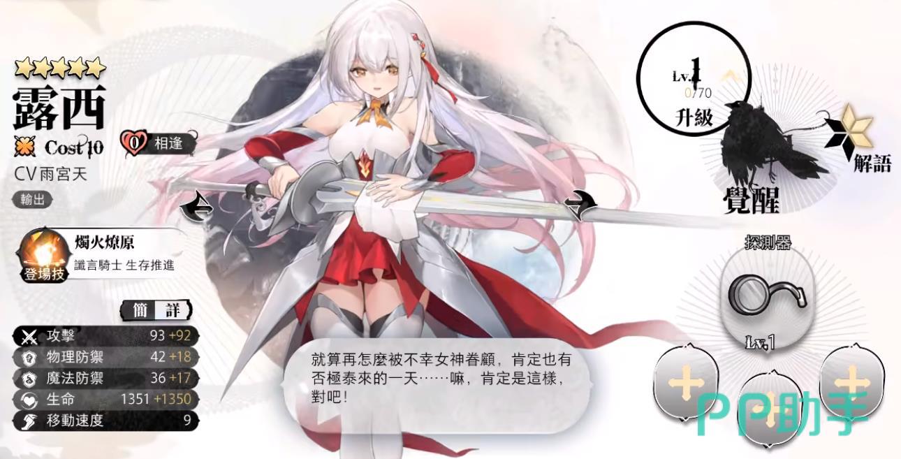 露西是五星的十费输出角色,初始属性数据:攻击力93,物理防御42,魔法防御36,生命值1351。