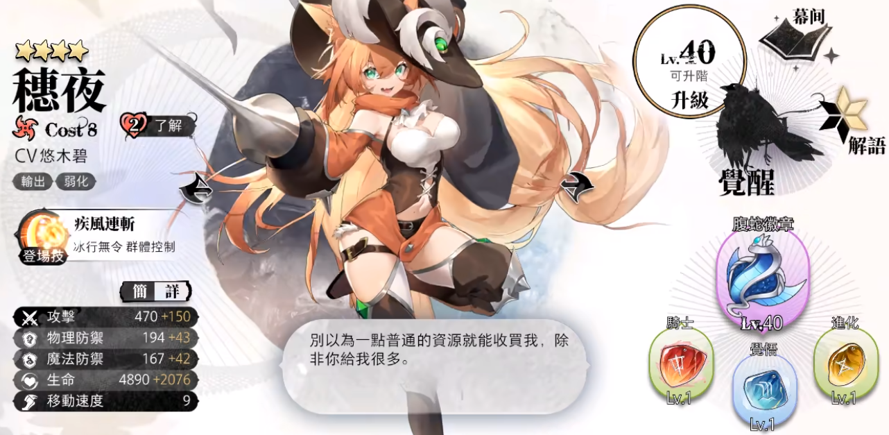 穗夜前期打单体比较好用,但由于四星角色拥有天花板,面板数值后期较弱。