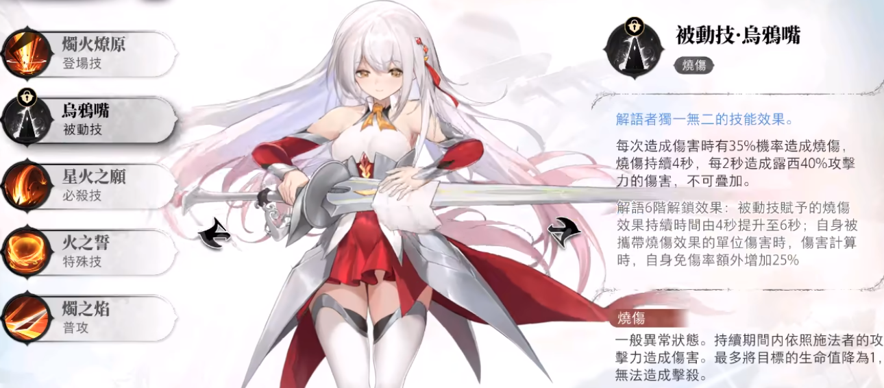 被动技能:乌鸦嘴。每次造成伤害时候有35%的几率,造成烧伤烧伤的效果持续4秒,每两秒造成自身40%攻击力的伤害,效果不叠加。这一个属于自身带来的异常负面效果,最多能够将生命值降到1,无法击杀。