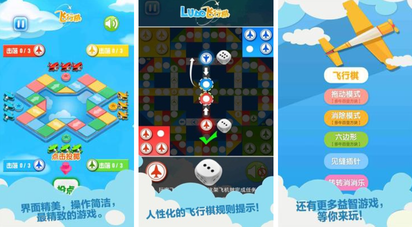 一起来进行飞机比拼战,让你感受飞机在天空中翱翔的乐趣。这款游戏不同于传统的飞行棋,它拥有更加丰富的玩法和更加精美的画面效果。在这里面只需要扔骰子来决定飞机前进的步数,如果碰到和自己飞机颜色相同的格子,直接跳出一大步,快速接近终点。游戏的目标是让自己的四架飞机都安全返回起点,所以大家在这个过程里面需要合理地利用骰子的点数,才能更好地获得胜利。