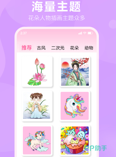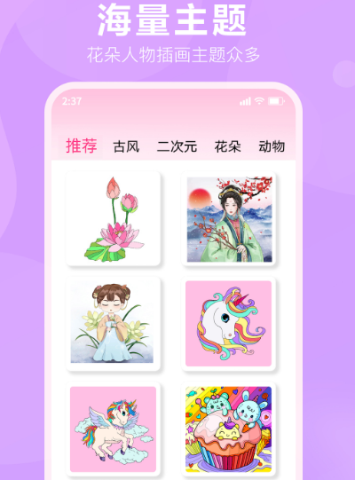 二次元是现在很多小伙伴都特别喜欢的类型,尤其是近几年,我们中国国漫不断的崛起,更多二次元人物纷纷出现在大家面前。如果你也特别喜欢填色,可以下载这款软件,填色之后所创作出来的作品还可以当做自己的头像当做桌面壁纸。其中除了有二次元之外,还有其他风格,比如人物艺术、动物花卉、世界地图等等。在填色的过程当中不需要太多复杂的设定,只要轻松动动手指,点击相应的色号即可完成。