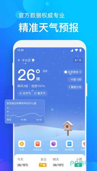 这是国内最早一批研究天气软件的APP,数亿用户都在选择,已经建立起了国内外数千个城市和景区的准确预报信息,为你的差旅提供更好的天气护航!可视化的雷达天气图以及精确到分钟的降雨信息会会给你的旅途带来不小的便利!详细的污染指数分析比其他软件更加细致,超多的细分功能满足你的不同需求,不管是语音服务还是天气+旅游壁纸,再或者你的旅行经验不是很足,那么这里的穿衣、防护建议将会很好的帮助到你!