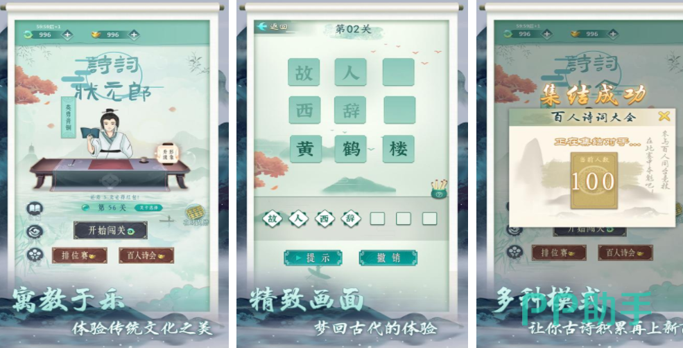 在这个游戏中把传统的中华美学和诗词结合了起来,玩家可以在这种非常古典的游戏画面里学习各种诗词知识,在这种精致的画面下会让玩家感觉自己回到了古代世界,同时也能通过游戏了解到更多的传统,不同的模式可以适应不同的玩家,可以在游戏中填写诗词里空缺的文字,也可以根据问题找到正确的诗句。