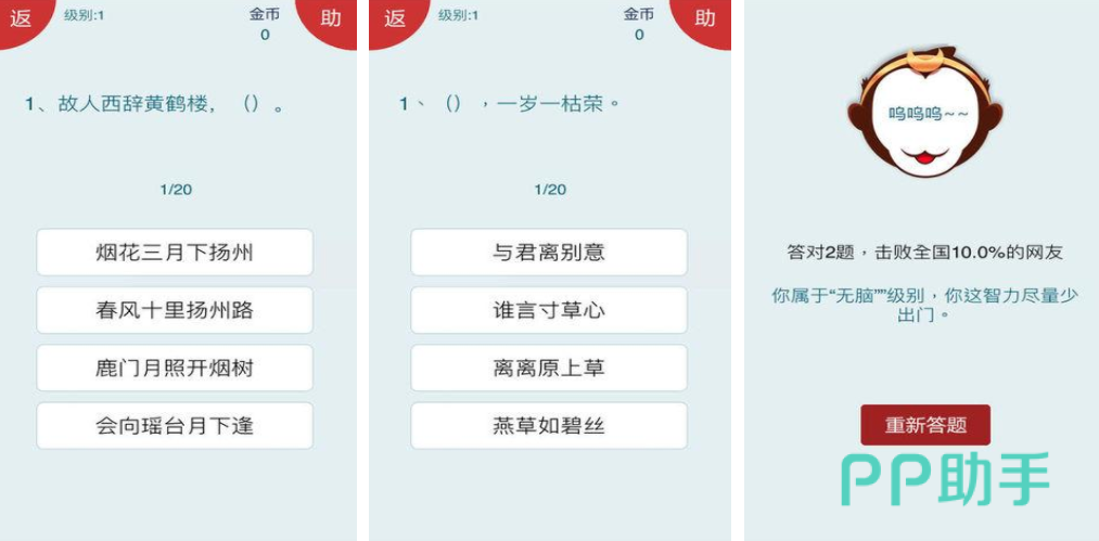 通过这个游戏,玩家会感觉到自己的记忆能力和智力得到了充分的考察,虽然游戏模式非常简单,只需要回答空缺的上联或者下联即可,但是这考察的是玩家对于诗词的储备能力,非常推荐学生们通过闯关更深刻的记忆古诗词,也能以这种轻松的方式掌握到更多的知识,对于学习非常有帮助。