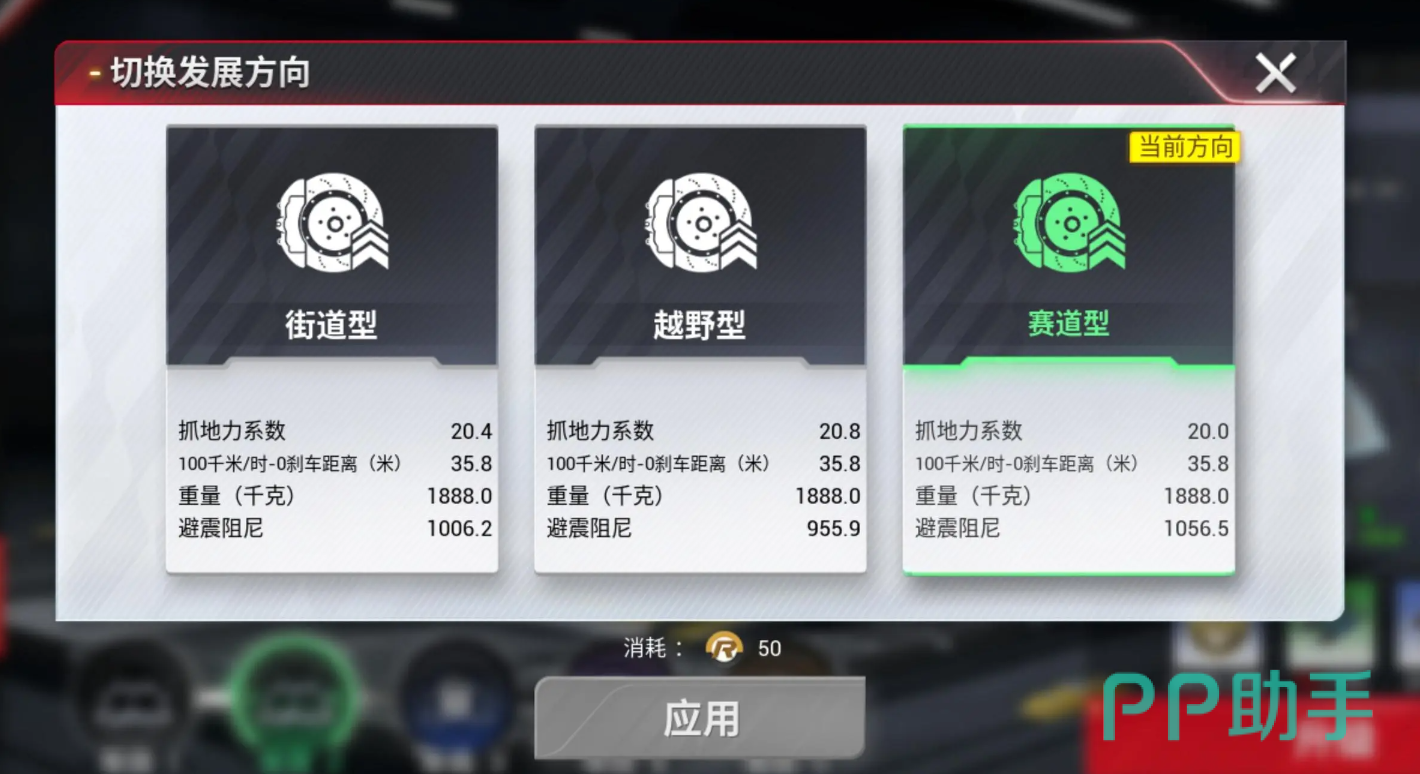 街道型、越野型、赛道型,这个就很好理解了,分别对应旧金山、阿尔卑斯、印第安纳这几种赛道地图。其中阻尼越大汽车的舒适性就越差,但对车身的支撑性就越好,更适合跑赛道。