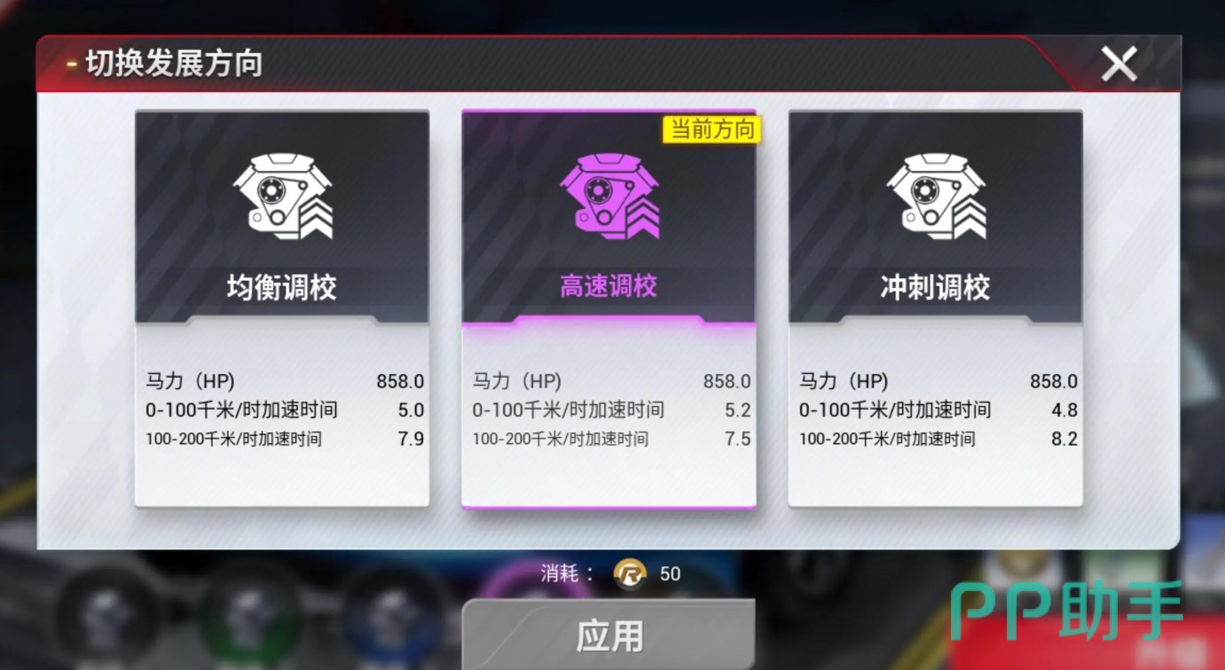 引擎的调整分这里笼统的分为三类,均衡、高速、冲刺。均衡属于通用路况,高速调教在后段的加速效果更好,适合长直线多的赛道;冲刺调教则是在前段的加速效果更好,适合短途冲刺。
