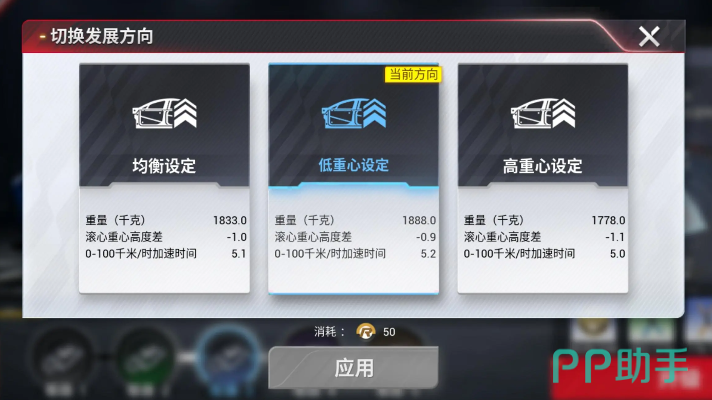 均衡、低重心、高重心三种设定,低重心漂移的时候转弯的半径会更小,手感会更好,但加速稍慢。一般低重心的比较适合漂移,高重心的冲直线。
