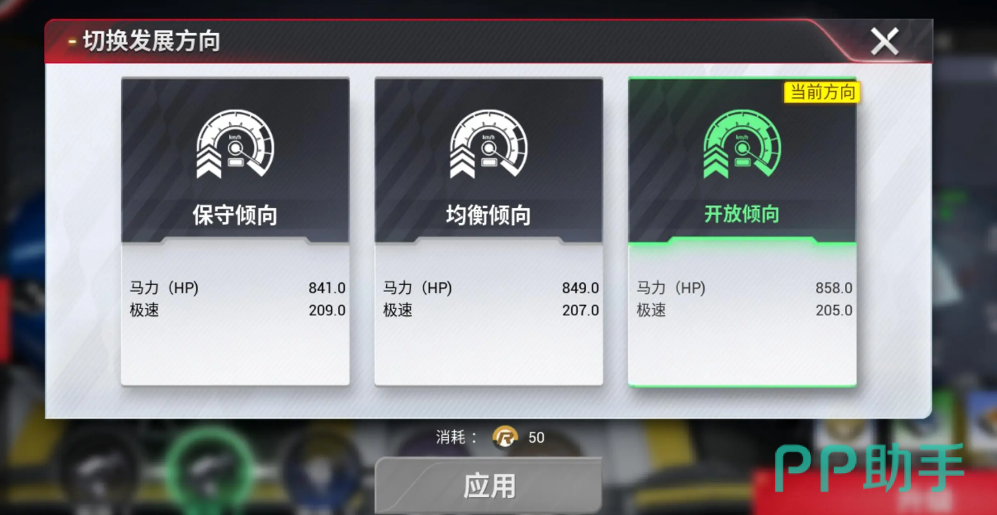 保守、均衡、开放三种倾向,保守用来跑直线,均衡适合复杂的路况,开放则适合弯道多的地图。