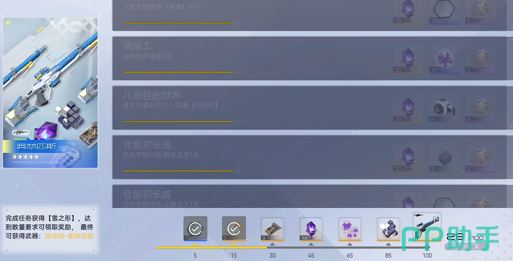 而且新手任务方面,完成游戏的前期主线任务达到100点汇集的话,就可以免费送一把金色五星级别的奥林匹斯雪之型狙击步枪。可以说,在武器获取方面,游戏前期狙击枪官方给的资源是最多的,也是最推荐各位前期作为主力培养的。