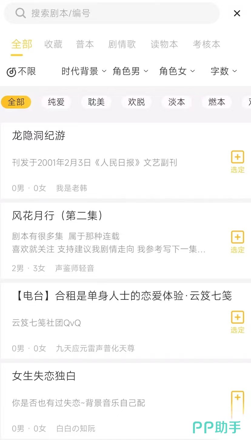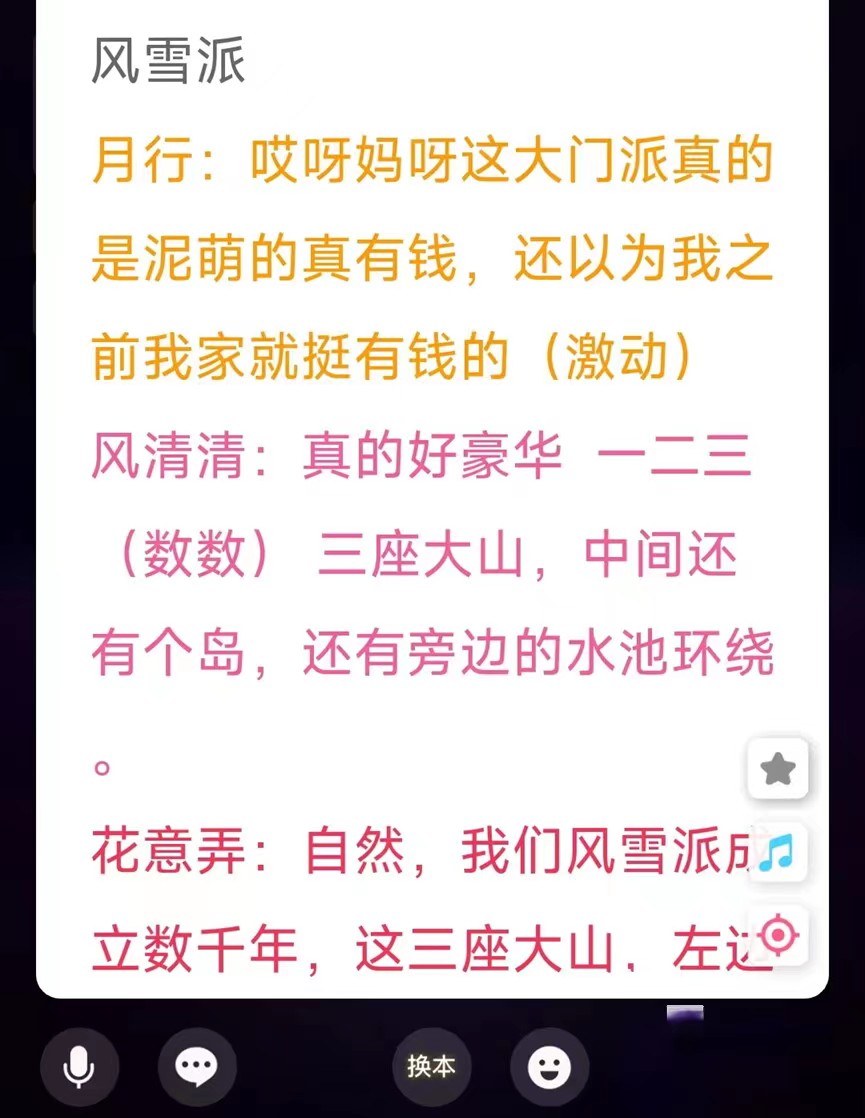 选择好了以后就可以直接进行pia戏了,这个时候剧本里面的台词都会显示在白色模块上面,而且划分的很清楚,不同的角色是用不同的颜色来表示的,这样大家也能够很好的对台词进行区分,当然在pia戏的体验过程中,各位玩家也可以适当的去提出一些自己的内心想法,比如说添加一些物体掉落的声音,或者是虚拟的词句,总之就是怎么自由怎么来。