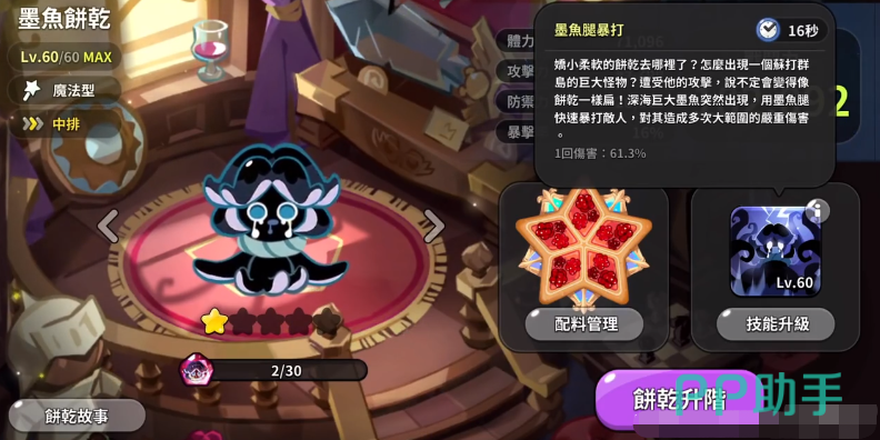 墨鱼饼干在外形上就是一只小墨鱼的形态,而且全身都是黑色为主调色彩,大家要是使用这个饼干人的话,它的技能是墨鱼腿暴打,这个技能是会使用几条墨鱼腿带来攻击的,所以也算是一个群体范围的伤害,在使用技能的时候墨鱼饼干本身其实是处于无敌状态里面的,它的技能也是一个连续击打的技能,释放一次可以带来5次伤害,伤害合在一起的百分比也有300%左右。