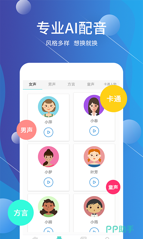 相信很多小伙伴在日常生活中都需要用配音来制作视频,但是有的小伙伴声音条件不是很好,如果自己录音就会非常尴尬,这款软件可以帮助小伙伴们解决配音的问题。在软件有非常智能的ai配音系统。小伙伴们可以将自己想要进行配音的对话输入到系统中,系统会自动识别文本并且进行配音。