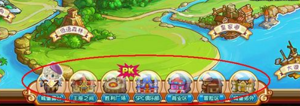 在地图中间的最下一排,我们可以看到几个常用的地点图标,分别是城堡露台、王座之间、胜利广场、SPC俱乐部、商业区、冒险区和城堡郊外。