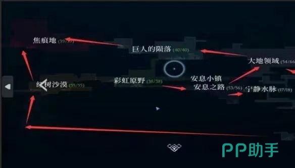 地图的规划路线应该是从彩虹原野开始出发,往地图的有房直走,到达安息小镇,可以选择两个方向来走,宁静水脉和大地领域都可以,只不过往大地领域走对多经过一个地点翡翠瀑布,之后也可以选择走引水渠,这两个都是可以到达放逐小镇.