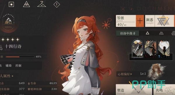 十四行诗虽然是游戏一开始就会送给玩家的角色,但该角色技能搭配十分完美,其中一技能具有很强的控制效果(二星以上),二技能还能为全队进行增益,大招更是倍率十分夸张的全体攻击,,即便是在面对能克制该角色的角色时,也依然保有较好的输出能力,更何况十四行诗的配队十分百搭,使得她成为了玩家在前期的推图主力。而且游戏还会送十四行诗的塑造,培养还有返还,进一步降低了十四行诗的养成成本。