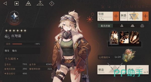 红弩箭是一位简单粗暴的现实创伤输出角色,其一、二技能和大招都有着不错的输出倍率,而且一技能在暴击后还能再进行一次额外的攻击,即便是在一技能的指定目标已经被消灭后,该额外攻击还能对另一目标生效,大幅提升了红弩箭的输出效率。此外,红弩箭的洞悉都能为她带来不错的暴击加成,使得红弩箭并不缺暴击率,也让一技能的额外攻击效果能在战斗中保持常驻。