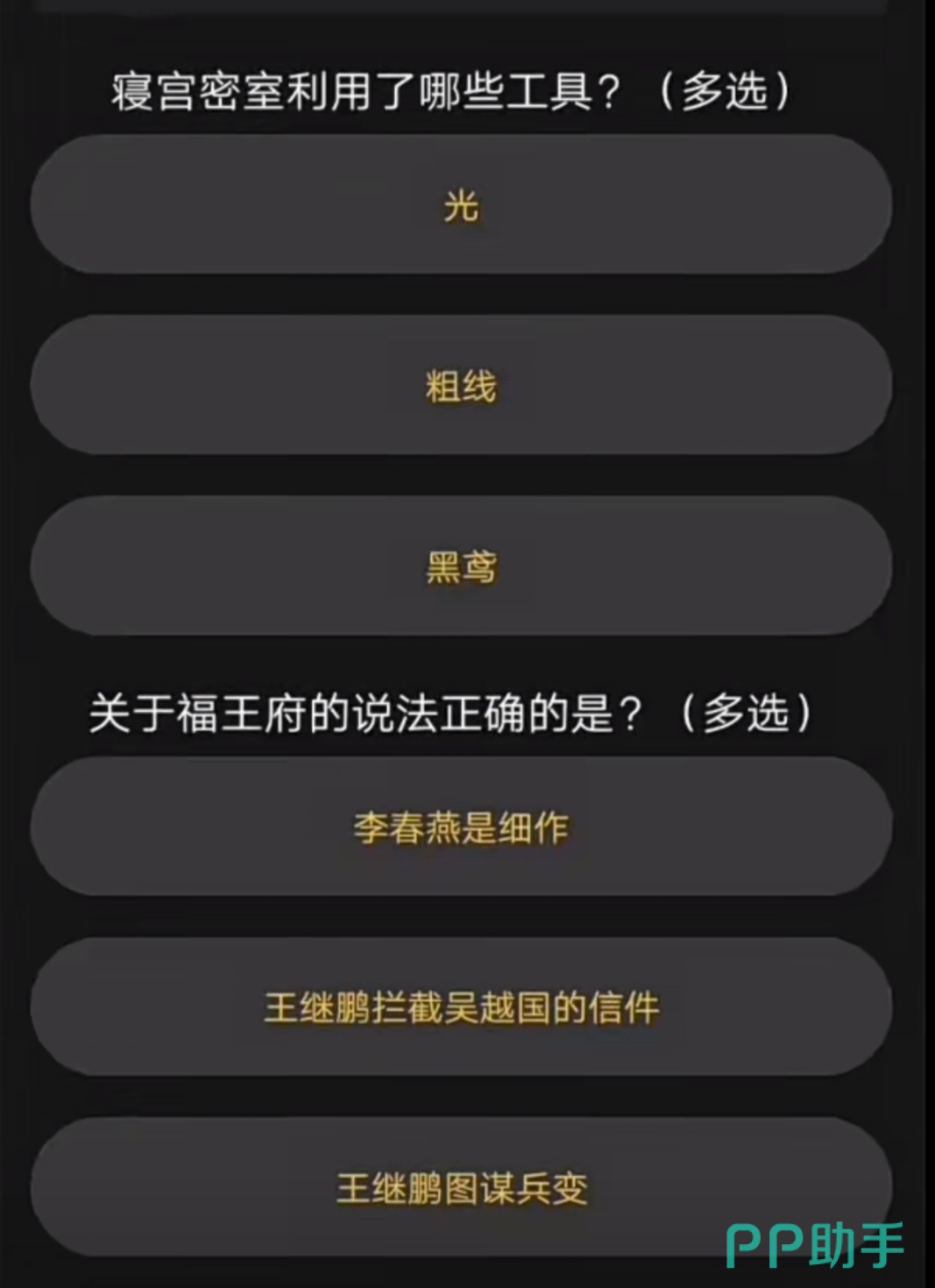 首先小编分享一下有关解密的答案。建王府密室密码是李世民,箱子的密码是夫妻。泉王府盒子的密码是琴。皇帝寝宫暗格的密码是归守明。