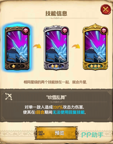 单体伤害技能,可对命中的敌人造成220%的攻击力伤害,并且让其在一回合期间内无法使用回复技能,可以很好的抑制敌方奶妈回血型角色的作用,技能升到2星级时对血量回复的制裁效果可持续两回合,满星时造成的身体伤害达到惊人的360%,面对敌方回血不死流阵容,古斯塔夫是不二人选。