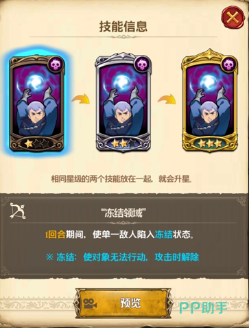 古斯塔夫的主要控制技能,但一次只能冻结一个敌人,冻结期间对象无法行动、无法释放技能和普攻,直至其进攻回合才会解除,升到两星时,被冻结的敌人将会受到伤害值80%的额外伤害,满级时伤害值提升到200%,如果命中敌方核心输出角色,自己的伤害再配合队友的如何进攻,其必死无疑。