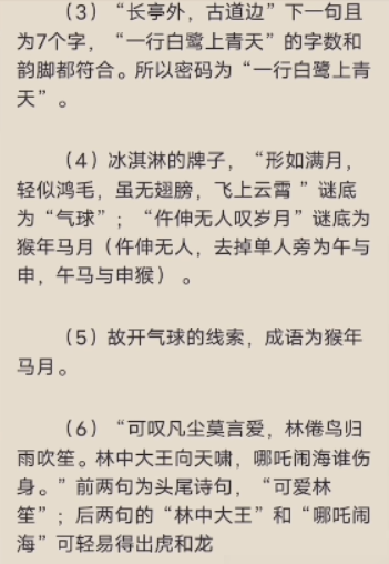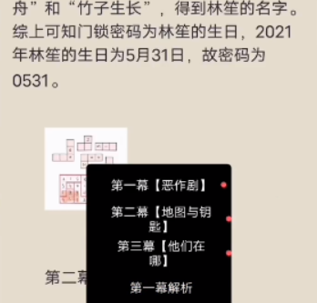 这时候玩家需要继续往后翻书,然后就能看见一个猜文字的谜题,所谓两个独木舟还有珠子生长其实也就暗示林笙名字了。所以门锁的密码为0531。在这一系列的步骤完成之后我们就可以进行闹钟密码的破解了。触碰闹钟玩家会被要求前往手机当中寻找答案。