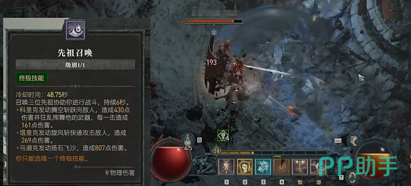 野蛮人的第一个技能是先祖召唤,可以将暗黑2中亚瑞特圣山上的三位先祖召唤出来并肩作战,三位先祖会持续6秒的时间,在此期间会不断释放技能。第二个技能是在武器上附带锁链,并变化接下来的三次攻击,第一次攻击猛砸地面附带眩晕。第二次挥砍前方造成流血,第三次是进行挥舞。最后一个技能是获得狂化和不可阻挡的状态,持续5秒。并且在接下来的10秒内使用基础技能造成伤害便可获得狂暴的状态,持续5秒。