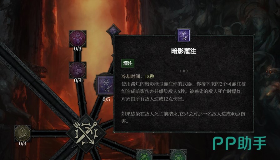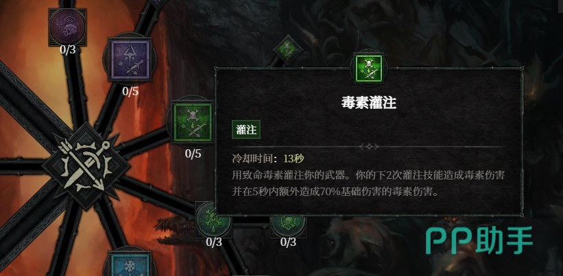 另一个方案是遇到单体boss比较难搞定的情况,那么优先升级“毒素灌注”,然后与其相关的被动各升1点,随后返回升级利用+1、狂血奔涌+1、极速+3,随后再返回将暗影灌注升1点。不管是哪种方案,最后都会到终极被动,升级精准,一般这个时候角色在35级,接下来的技能加点,无论是哪一种方案,都是优先将暗影灌注升满或者将毒灌注点出来。