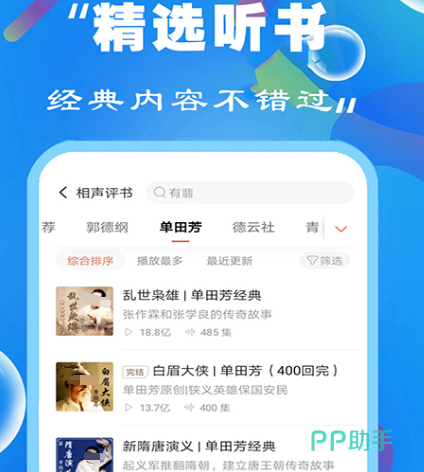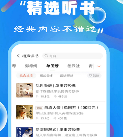 这个软件也是一个能免费听书的软件,更是一个可听有声小说的软件,作为酷狗音乐旗下非常受欢迎的听书软件,既可以帮助睡眠,也可以缓解压力。比如听名家的评书,还有历史人员相应的音频内容。有了这个软件以后,随时随地都可以听,满足各个年龄段人群的需求,如果很喜欢听搞笑段子的话,在这里也有很多知名人士所说的脱口秀。